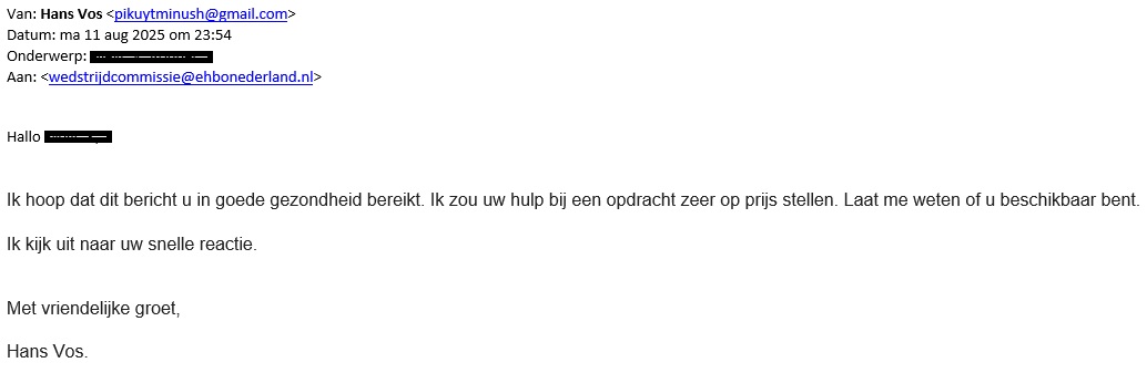 Mocht je een dergelijke mail krijgen, check dan altijd het mailadres. Die is vaak gekunsteld. Onlangs werd bijvoorbeeld de mail gestuurd vanuit het mailadres voorzitter.ehbonederland@outlook.com.